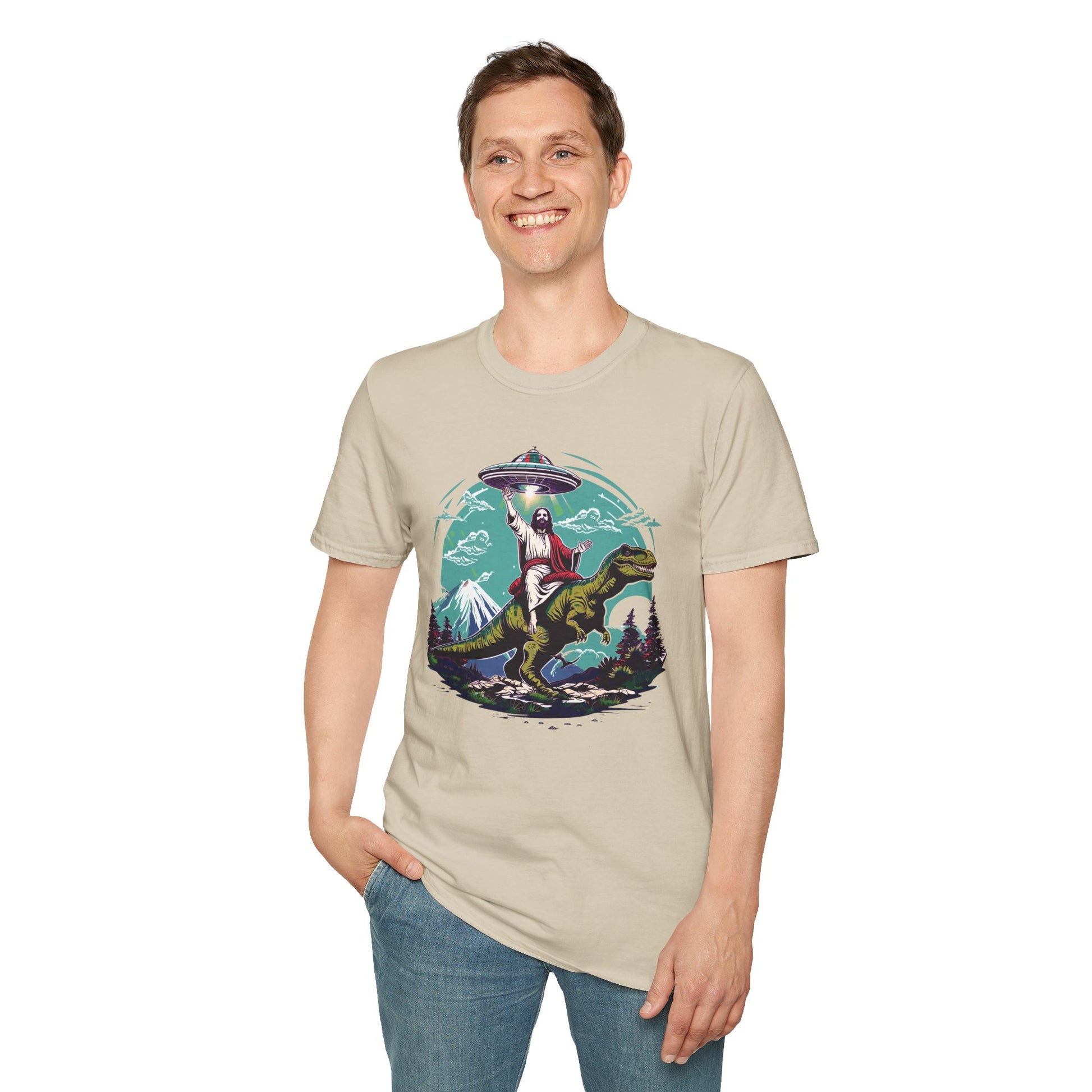 Gloriously Absurd & Unforgettable: This isn't just a t-shirt; it's a masterpiece of chaotic good. The epic graphic of Jesus riding a T-Rex while hailing a UFO is guaranteed to turn heads and start conversations.